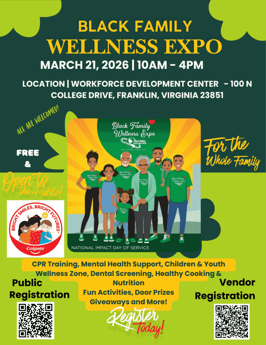 The Black Family Wellness Expo sponsored by the Suffolk (VA) Chapter of the Links will take place on Saturday, March 21, from 10 a.m.-4 p.m. at the Workforce Development Center, located at 100 North College Drive, Franklin, Virginia 23851.