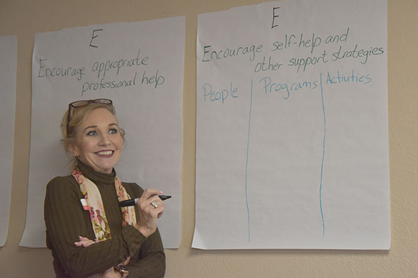 Rader spoke about the stigma surrounding mental health, and how it makes it hard for people to talk about what they are struggling with. She asked participants to write on sticky notes three phrases they had heard people use when talking about mental health challenges. Then they were to place the notes in corresponding categories – Stigmatizing, Possibly Stigmatizing or Not Stigmatizing. Most of the answers were considered stigmatizing.