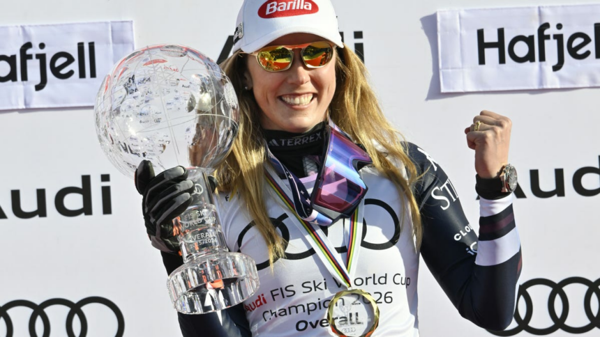 The overall title caps a spectacular season for Shiffrin. She won her third Olympic gold medal at the Milano Cortina Olympics last month, and also set a single-season record for most wins in a single discipline with victories in nine of the 10 slalom races.