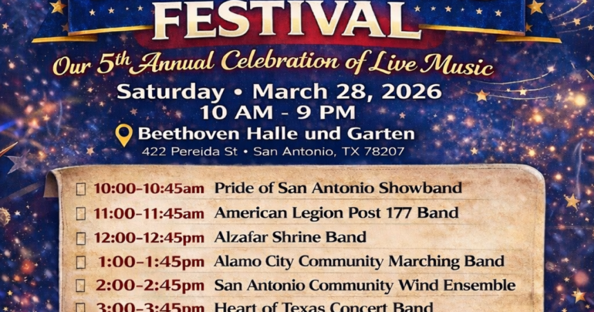 The Greater San Antonio Community Bands Association will hold its 5th annual Community Band Music Festival on Saturday, March 28, 2026 from 10 am to 9 pm. The GSACBA is composed of 11 community bands in the San Antonio area and more than 500 musicians will perform throughout the day. They have all teamed up to present some amazing wind band music for the public. The oldest German Band outside of Germany will perform along with the award winning Heart of Texas Concert Band.