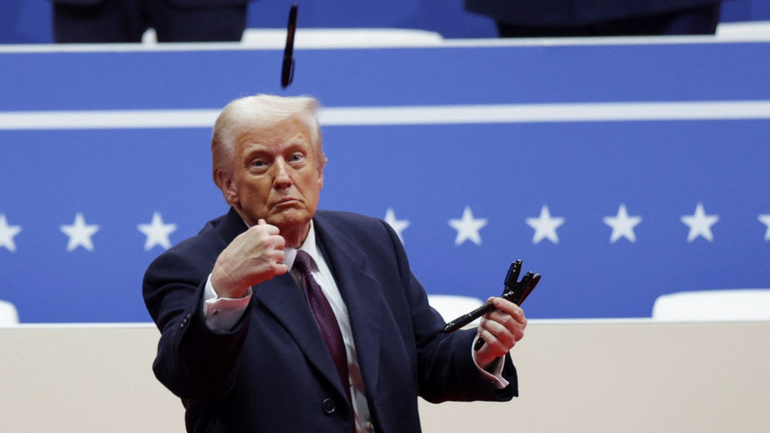 U.S. President Donald Trump throws a pen during a rally on the inauguration day of his second Presidential term, inside Capital One, in Washington, U.S. January 20, 2025. (Mike Segar/Reuters)