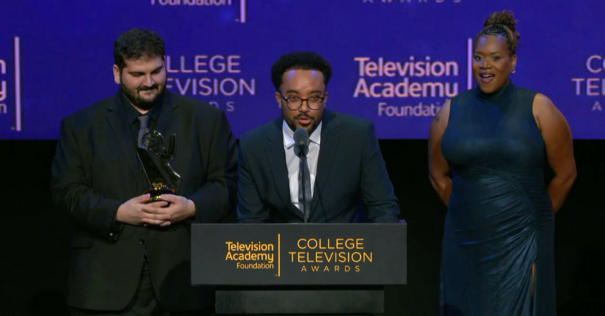 Shandaeya Caldwell, Neil Zafar Haeems and Christian Yosef (University of Southern California) accept from accept the College Television Award for Scripted Series for Trife.