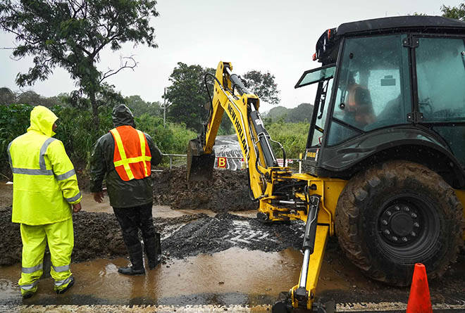 Crews work to mitigate flooding along Farrington Highway in Waialua as heavy rains continues to pound Oahu’s north shore communities of Waialua, Haleiwa, Mokuleia, and Pupukea today.