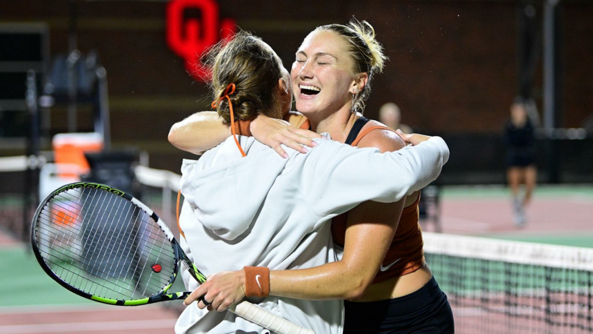 Texas was without freshman Christasha McNeil due to injury, which shifted the doubles lineup, but sophomore Salma Drugdova paired with Meri, and the duo was first off the court with a 6-3 win over Addison Bowman and Mary Sidelnyk at No. 3. Herea and freshman Mathilde Ngijol-Carré then moved up to No. 2 but came up short in back-and-forth match, 6-4, to Maria Andienko and Amina Salibayeva. That left it to No. 1, where Abbagnato and freshman Elizabeth Ionescu partnered for a 7-5 victory over Karla Bartel and Klara Milicevic to clinch the points.