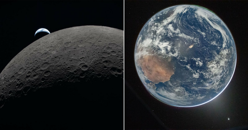Split image: left side shows Earth rising above the Moon's cratered surface; right side shows a full view of Earth from space, with clouds, oceans, and continents visible against the black background.