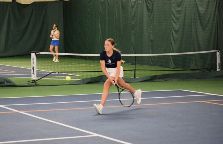 Minot North’s Alyviah Kopp tracks down a ball during her doubles match on Friday, April 24, at Cameron Indoor Tennis Center. Kopp and teammate Braxtyn Bennett won in three sets, 6-7 (4), 6-2, 6-1, over Bismarck St. Mary’s Tessa Rykowsky and Sophie Juelson. Mike Kraft/MDN